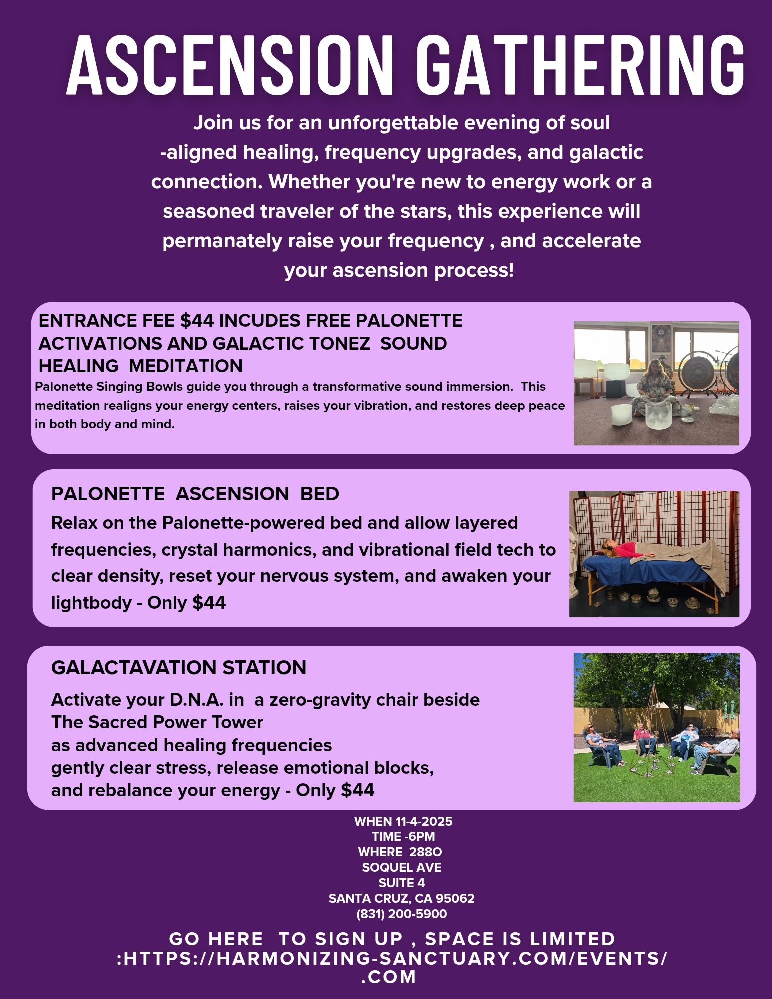 This event takes place at Harmonizing Sanctuary, where an Energy Light System creates a healing toroidal field known to support detox, reduce inflammation, and enhance immunity. Within this amplified environment, the resonance of the bowls and angelic voice becomes even more potent intensifying your experience of release and remembrance.